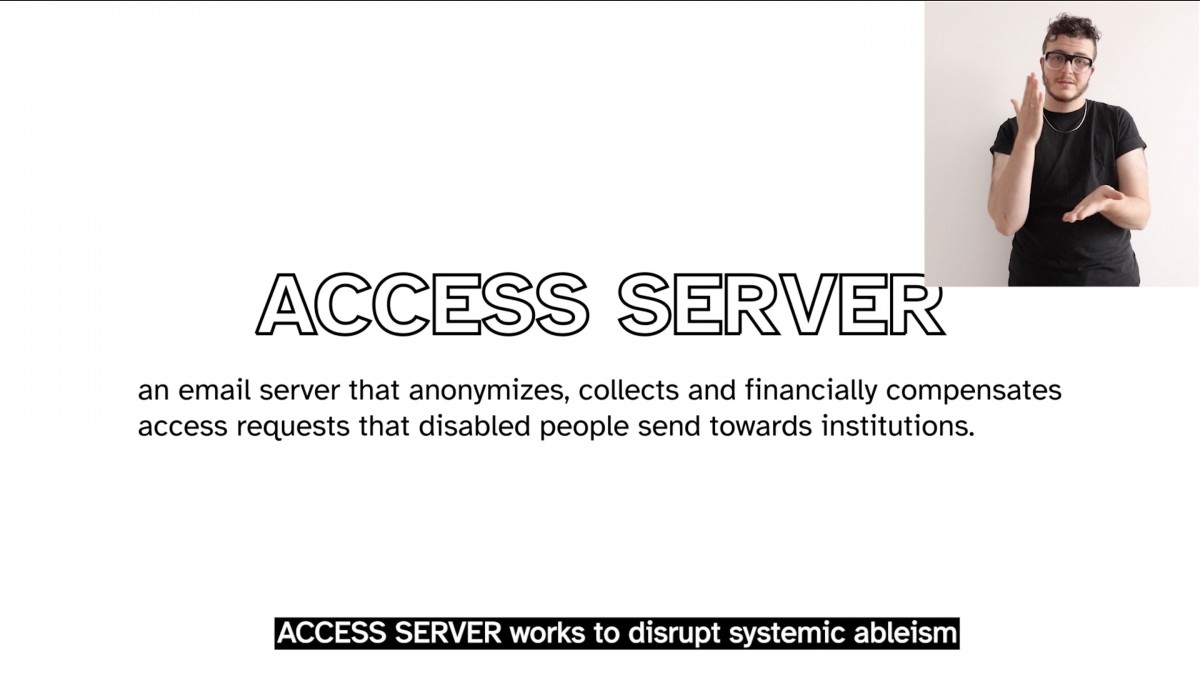 As a digital arts tool, ACCESS SERVER disrupts systematically ableist cultural institutions in Europe. The project is threefold: For disabled people, it offers email templates and 20€ per email to account for the labor of asking for access such as closed captions, alt texts, sign language and scent-free spaces. All emails routed through the server will link to the website in the footer, and automatically cite previous access requests to the same institution. For institutions, it provides information on how to make spaces, events and websites more accessible and how to respond to access requests. In events called ACCESS SPARKS nondisabled and disabled people can share and learn about access.