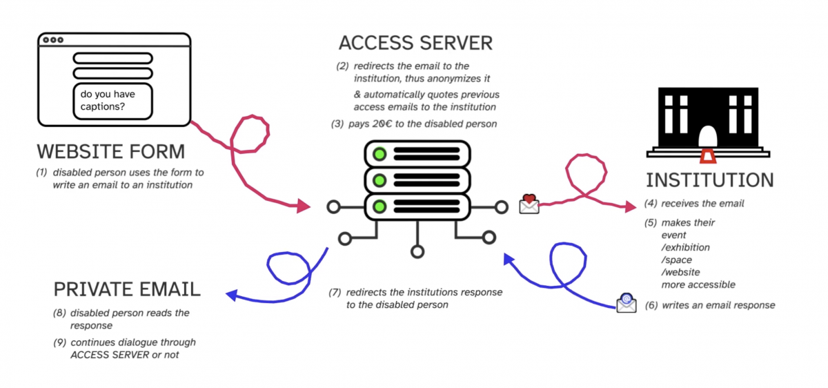 ACCESS SERVER is an email server that anonymizes, collects and financially compensates access requests that disabled people send towards cultural institutions. Access requests explain what a disabled person needs to attend spaces, be they online or physical. The project is currently in the conceptual and prototyping stage.